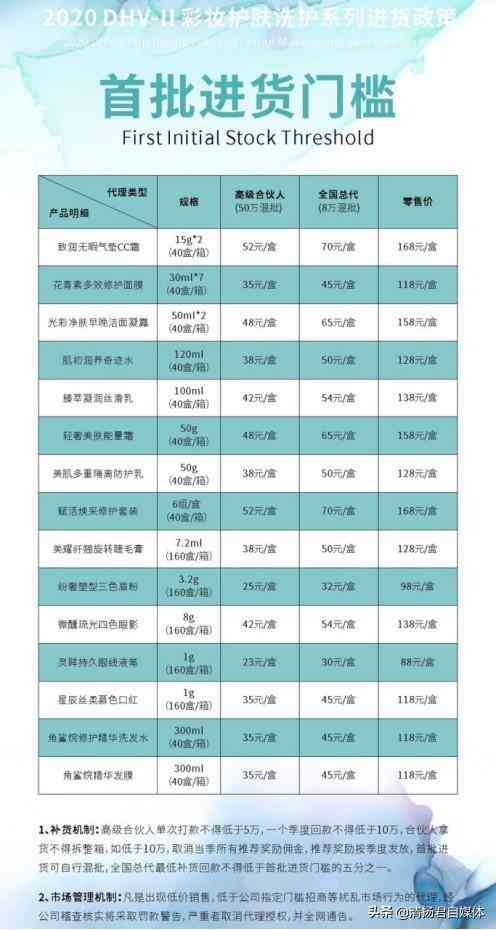 补货机制:高级合伙人单次打款不得低于5万,一个季度回款不低于10万,合伙人拿货不得拆整箱,如低于10万,取消当季所有推荐奖励佣金,推荐奖励按季度发放,首批进货可自行混批,全国总代最低补货回款不得低于首批进货门槛的五分之一。