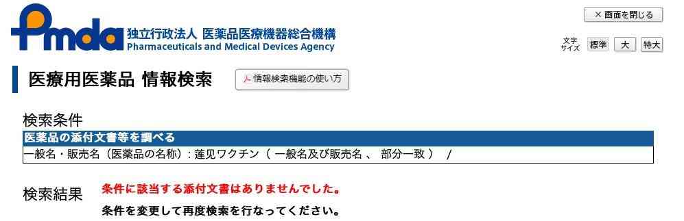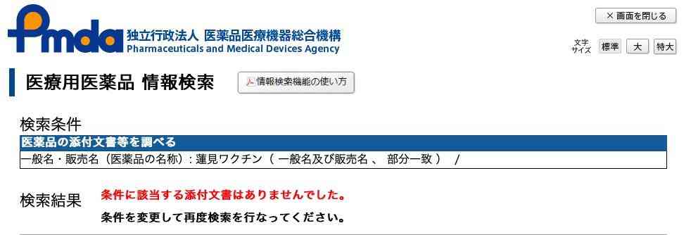 根据日本厚生劳动省方面分类,疫苗类生物制品属于“医疗用医药品”范围,南都记者分别以“ハスミワクチン”(莲见疫苗片假名)、“莲见ワクチン”和“蓮見ワクチン”分别进行检索,发现数据库中并无相关“疫苗”的批文。