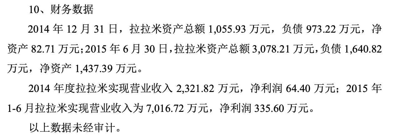 此外,搜于特、潮宏基的对外投资公告还显示,拉拉米还向两家公司承诺,经财务规范后,拉拉米2015年的销售额将不低于2.5亿人民币,2016年的销售额将不低于4亿人民币,2017年的销售额将不低于6亿人民币,并且拉拉米将力争于2016年下半年实现在新三板公开挂牌并尽力于 2018年正式提交在A股IPO申请。