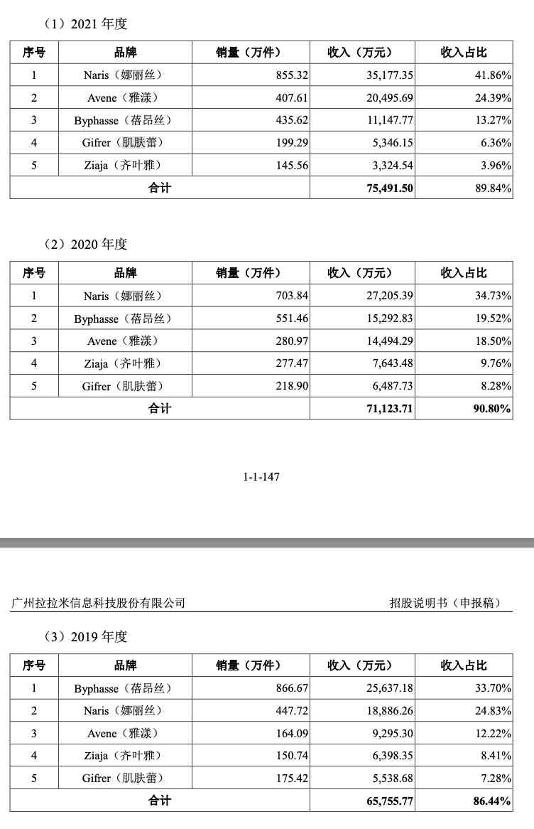 原因之一,拉拉米极度依赖小众美妆品牌,报告期内,公司孵化的Naris(娜丽丝)、Byphasse(蓓昂丝)、Avene(雅漾)、Ziaja(齐叶雅)、Gifrer(肌肤蕾)五大美妆品牌合计占营业收入的比重分别为86.44%、90.80%、89.84%,其中娜丽丝功不可没。