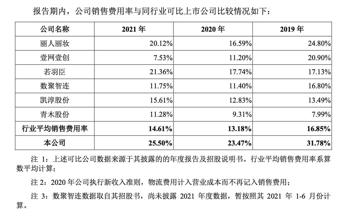 2019年-2021年,拉拉米销售费用分别为2.42亿元、1.84亿元和2.14亿元,占营业收入的比重分别为31.78%、23.47%和25.50%,远超行业平均水平。其中,仅市场推广费分别为9283.39万元、1.05亿元和1.26亿元,近三年花了3.24亿元,主要分为站内的直通车、钻展、聚划算、淘宝 客佣金等推广费和站外的通过小红书、微博、微信等渠道进行达人推荐、明星代言等。