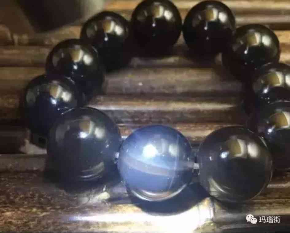 而黑曜石底色全黑,但是其在底子上有单色或是彩色的条带状或是瞳孔状的光晕。这是黑玛瑙和黑曜岩最明显的差别。在强光下仔细观察珠子表面,有就是黑曜石,没有就是黑玛瑙。