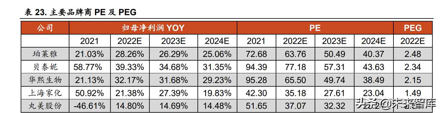 PEG 角度:品牌商 PEG 的区间范围为 1.5-2.5X。组织架构高效,盈利 能力稳定的公司通常 PEG 水平较高,比如珀莱雅。部分景气细分赛道拥有 较明显的研发壁垒或背书壁垒,代工普及化和营销多元化背景下,竞争格局 优于的传统化妆品赛道,存在估值溢价,通常 PEG 水平较高。比如贝泰妮所 处的敏感肌护肤赛道增速高,且顾客复购率高,皮肤科医生背书打造薇诺娜 品牌独特的竞争壁垒;华熙生物拥有玻尿酸研发壁垒,主打“玻尿酸+”护肤 概念,“成分党”崛起使其功能性护肤品业务发展壮大。上海家化除经营美容 护肤产品外,个护和母婴产品营收占比也较高,PEG 水平低于化妆品业务营 收占比较高的公司。丸美股份过去 2 年归母净利润均同比下滑,PEG 水平不 具备参考价值,PE 估值水平未超过 40-60X 估值上限。
