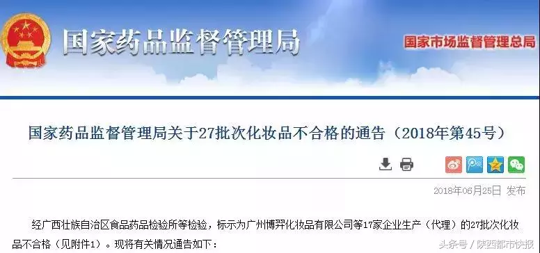 近日,国家药品监督管理局官网发布《关于27批次化妆品不合格的通告(2018年第45号)》称,17家企业生产(代理)的27批次化妆品不合格!