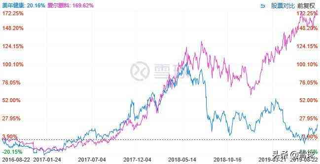 如果看2016年到2018年,两家公司的收入和利润也相当(本来还有家做口腔的通策医疗也是模式类似,但是体量比这两家小,而且和爱尔更像,本文把他归为和爱尔),而且从2016年8月看两家公司的市值也基本相同,意味着估值也基本一样。但是到现在两家公司股价表现相差甚远,爱尔涨幅169%市值已经1040亿,但是美年涨幅仅20%市值只有479亿,两年的时间,市值拉开一倍的距离。