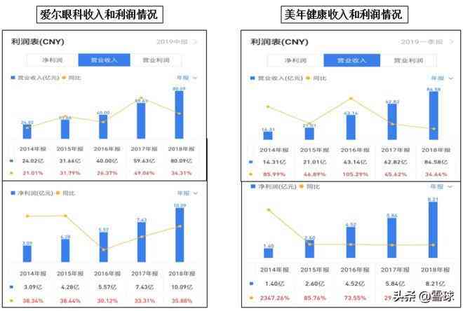 股价强弱背后是两家公司业绩表现的强弱体现,虽然2018年以前这两家公司的收入利润几乎相同,但是2019年上半年,爱尔眼科收入47.49亿,同比增长25.64%,利润同比增长36.53%,继续保持高增长,但是美年健康收入预计只有36.41亿,增长停滞,利润同比下滑60-90%至只剩1588万-6352万。