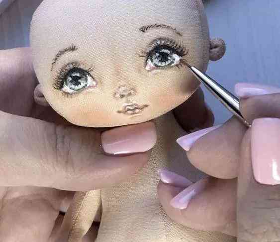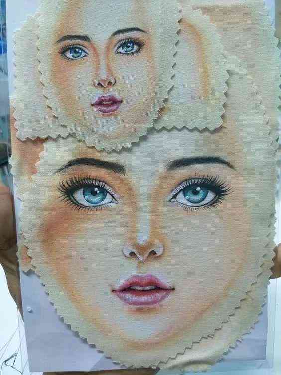 准备一块肤色的布,用颜料和化妆品画出娃娃的脸,或有印染好现成的布料,也能直接使用。如果不会画画,觉得太复杂,可先剪出椭圆形的布,做出头部,最后用珠子或绣线缝出眼睛嘴巴即可。