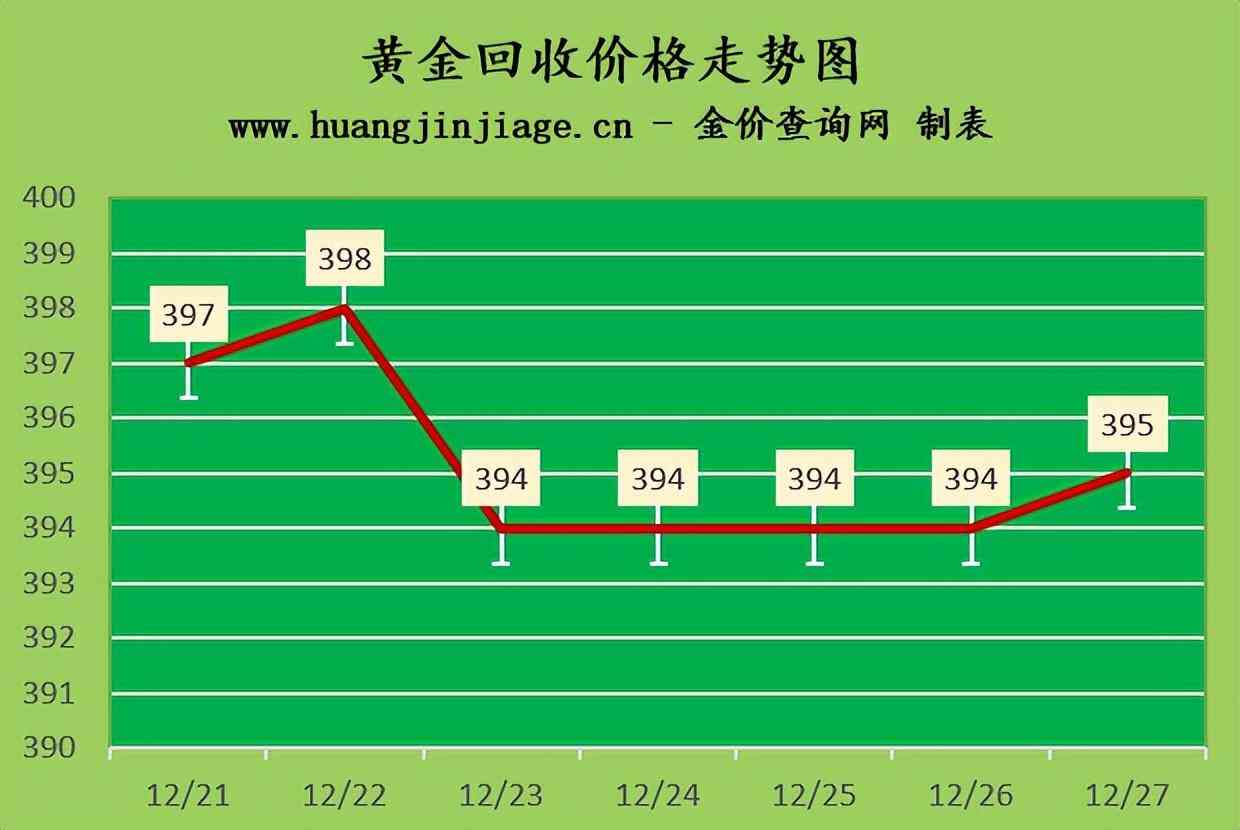 黄金回收价格395元/克,铂金回收价格196元/克,钯金回收价格357元/克,18K金回收价格291元/克,银条回收价格3.8元/克。(黄金行情是波动的,回收金价没有固定标准。)