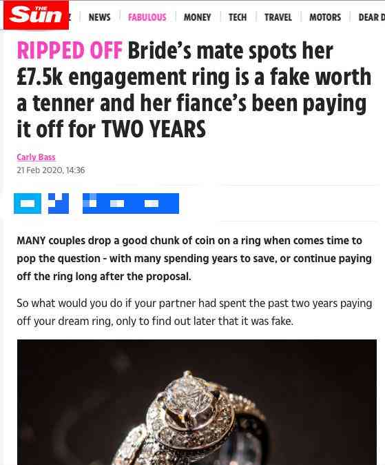 据英国《太阳报》2月21日报道,英国一名女子在一个专门讲述“那些婚礼中的糗事”的社交媒体账号上匿名透露,她的未婚夫分两年定期付款购买的一枚价值7500英镑(近人民币7万元)的订婚戒指,后来发现竟然是假的,其原材料价格实际上也就值10英镑左右(价值不足人民币100元)。