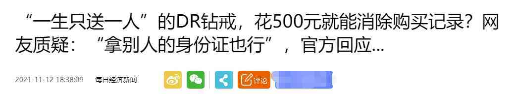 这不,最近“一个男士一生仅能定制一枚”的DR钻戒就彻底翻车了,有网友发帖称,DR钻戒的购买记录花500元就可以消除!