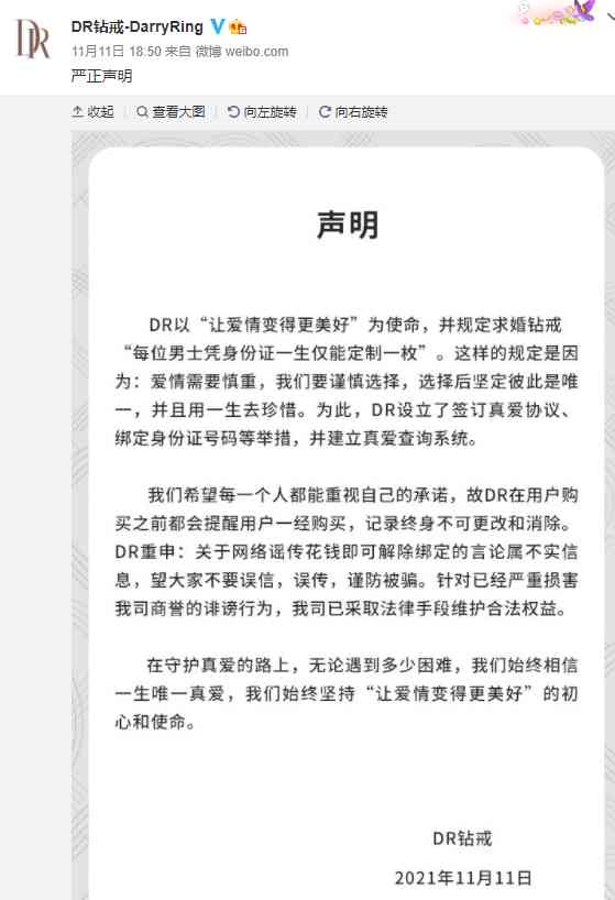 针对网络上舆论的发酵,DR钻戒官方也很快在微博发表了相关的声明称网络上谣传的花钱就可以解绑真爱的问题并不属实,公司不支持删除和解绑信息,用户一经购买,记录终生不可更改和消除。