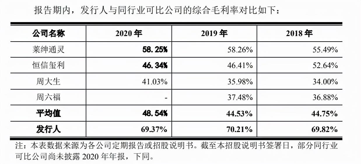 根据招股书显示,2018~2020年,公司综合毛利率分别为69.82%、70.21%、69.37%,每年接近70%的毛利率与同行业可比公司莱绅通灵、恒信玺利、周大生、周六福相比,平均高出20~30个百分点。