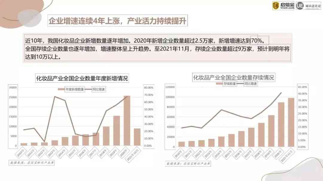 2021年1-11月 中国化妆品市场规模达3678亿元,超过2020年全年,增速达15.3%。入局化妆品行业的企业数量也在不断增加,2020年新增企业数量超过2.5万家,新增增速达到70%。截至2021年11月,存续企业数量约为9万家,预计到明年将达到10万以上。