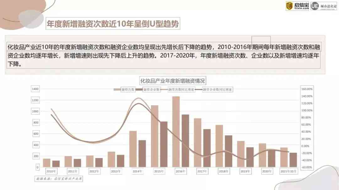 新增企业的快速入局,离不开资本的推动,行业的融资情况也始终备受关注。《报告》显示,到2020年,年度新增投资次数已突破4500次,但近十年的年度融资次数和融资企业数量并未如预期的一样持续增长,而是呈现了先增长后下降的趋势。2010-2016年期间每年新增融资次数和融资企业数均逐年增长,2017-2020年,年度新增融资次数、企业数以及新增增速则呈现逐年下降。这说明资本市场对美妆市场的态度正变得越来越谨慎。