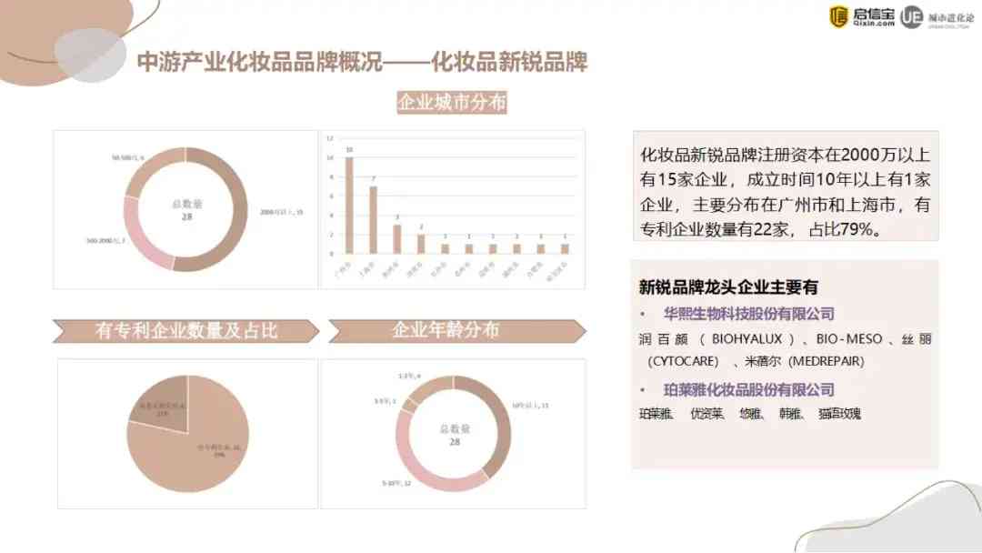 同时,国内新锐品牌也不断崛起,占领彩妆、护肤、男士个护、口腔护理等各个细分赛道。其中新锐品牌注册资本超过2000万的有15家企业,有专利技术的企业数量为22家,占比79%。