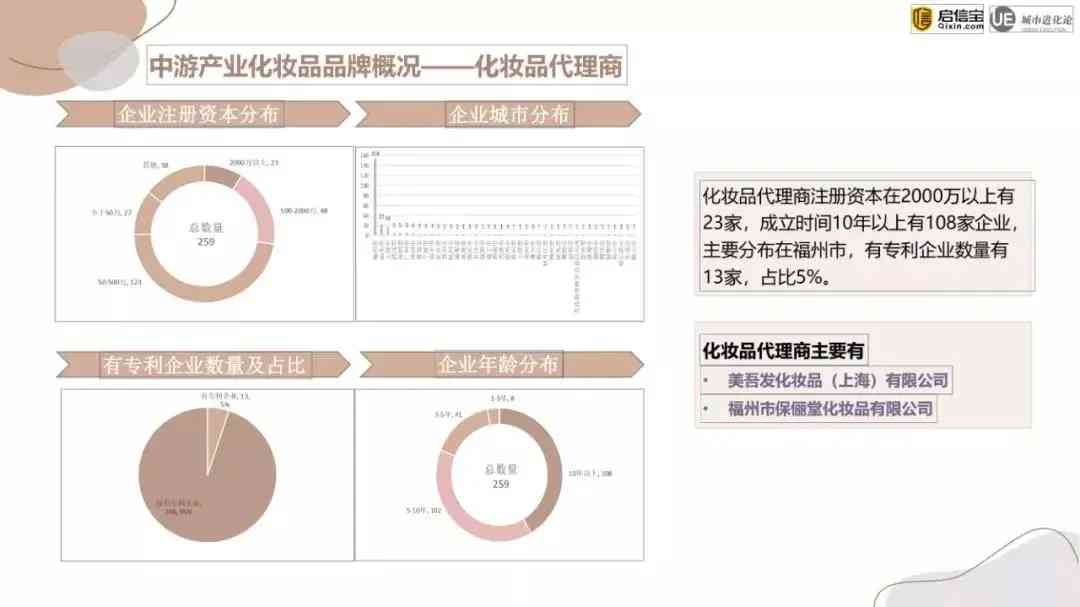 深圳市是全国护肤企业数量最多的城市,有1070家;我国化妆品代理商最为集中的城市则是福州市。全国化妆品代理商总数为259家,注册资本2000万以上的有23家,成立时间超过10年的有108家企业。