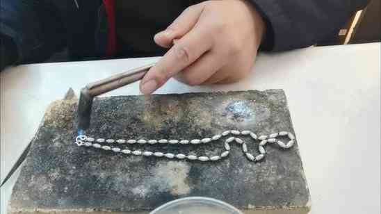 顾客的s925转运珠项链,开焊断掉了,于是找到珠宝工匠老张进行维修在交流的过程中得知,此顾客由于相信佩戴此项链能给自己带来好运,结果自己不小心戴断了,想找到维修师傅帮她维修一下,希望这条转运珠项链继续给自己带来好运。