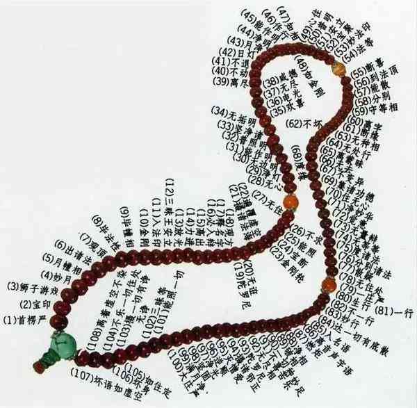 108 颗:表示求正百八三昧, 断除一百零八种烦恼, 一百零八种烦恼一般说法是六根 (眼, 耳, 鼻, 舌, 身, 意) 各有苦、乐、舍三受, 合为十八种, 六根各有好、恶、平三种, 合为十八种, 总计三十六种, 再以过去、现在、未来三世合为一百零八种烦恼。