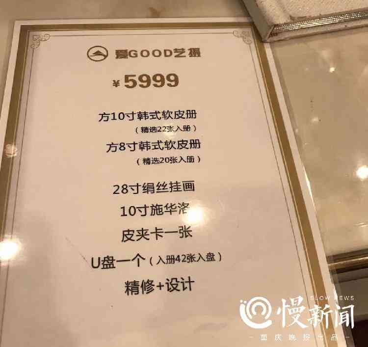 陈女士告诉上游新闻·重庆晚报慢新闻记者,她在半个月前通过微信公众号,找到了一家名为“爱Good艺摄”的影楼。对方客服介绍,目前店内一款399元的写真套餐正在做活动,包含4套服装拍摄、12张精修底片、一本7寸相册外加7寸摆台。后期加选照片入册,价格是69元/张。