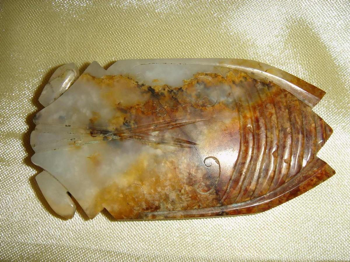 这种汉八刀的工艺有两重含义,.是指玉蝉在雕刻的时候刀工简练粗犷,并不像佩蝉或冠蝉一样着眼于细节,所以就好像只刻了八刀一样干脆利落。