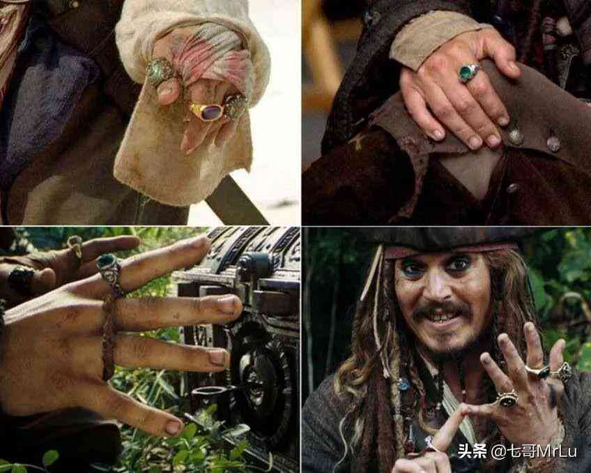 另外杰克船长从一名西班牙水手遗孀那偷来一只由玛瑙、三颗小宝石、花朵图案的金色戒指,实际上也是德普 “借给” 他的。