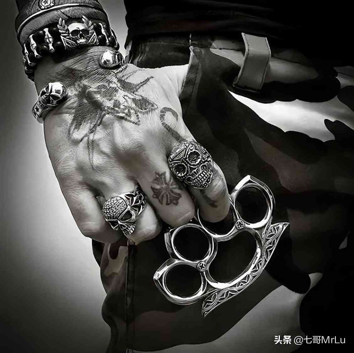 美国早期的飞手党,就很喜欢戴满整只手。不过他们并不是为了好看,而是单纯为了代替被禁用的手指 “按摩” 工具 —— 指虎。