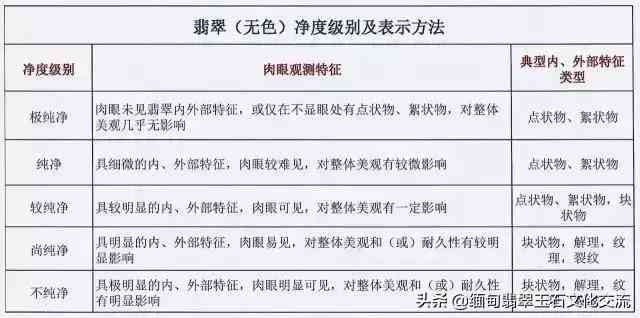 根据内含物对翡翠美观和耐久性的影响程度,将净度分为五个级别。(见表)
