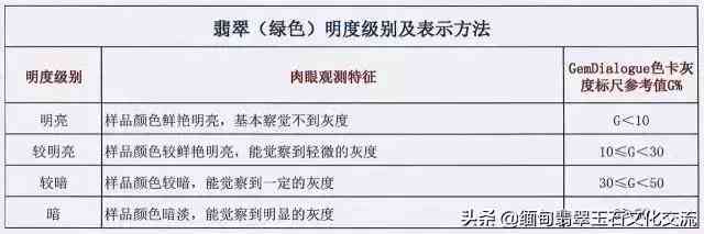 明度是指翡翠颜色的明暗程度,即俗称“浓、正、阳、匀”中的阳。按照翡翠的灰度将明度分为四个级别。(见表)