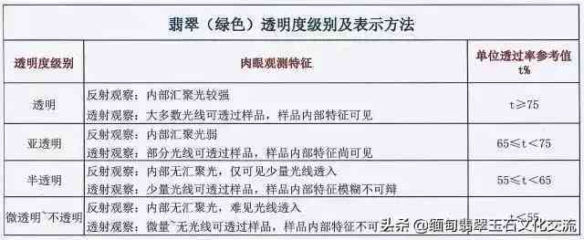 翡翠(绿色)透明度受颜色影响,彩度升高,明度降低透明度会随之降低,考虑和排除颜色对透明度的影响,翡翠(绿色)的透明度分为四个级别。(见表)