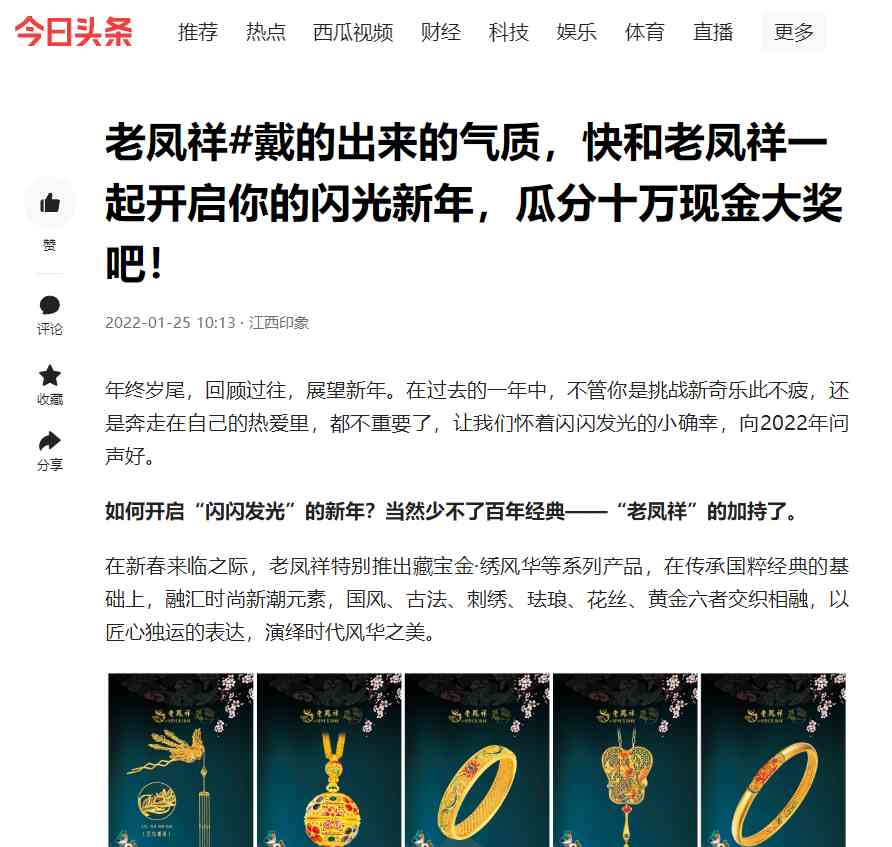 这个春节,由@老凤祥江西发起的#戴的出来的气质 抖音话题挑战赛正式收官,网友们再次被百年经典的国潮新风尚所震撼到,纷纷留言表达对老凤祥的支持与喜爱,更有不少网友前往线下各大门店,试戴并购买藏宝金·绣风华系列产品,趁新春活动狠狠薅了一波羊毛~