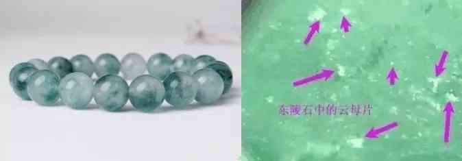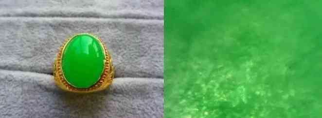 绿色东陵石的底色,油绿不正,上面有光亮的小点(其实是“砂金效应”)。在放大镜下,可以明显看到粗大的铬云母片,大致定向排列。在查尔斯滤色镜下观察,绿色铬云母片呈现红色。这些是翡翠都没有的。