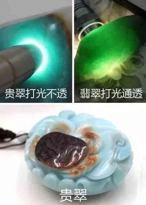 贵翠的质地不纯净,里面有很多杂质,翡翠与之相反。浇水后,贵翠的颜色会变得很亮丽,可以看到深浅的条状或斑驳花结构,翡翠不会这样。在强烈的阳光下观察,贵翠的透明度会降低,颜色也减弱,翡翠只会更美丽。