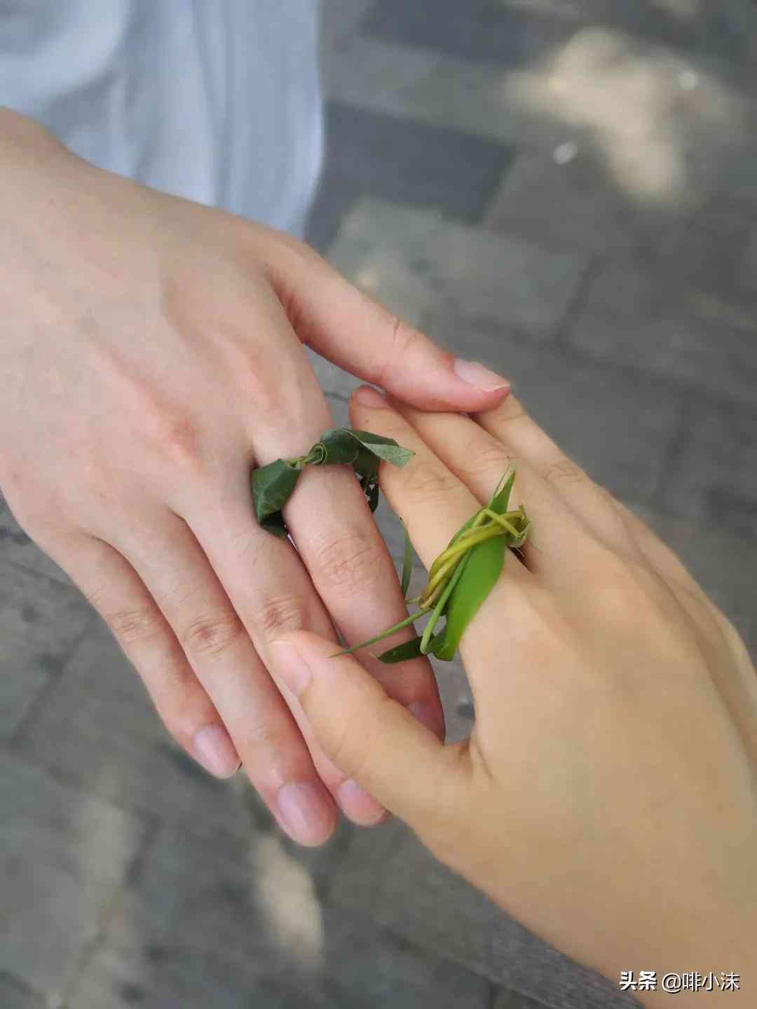 这张图是领证前的某天,跟率哥约会,他顺手编的草戒指送我的。我很开心,很喜欢,现在还珍藏着。