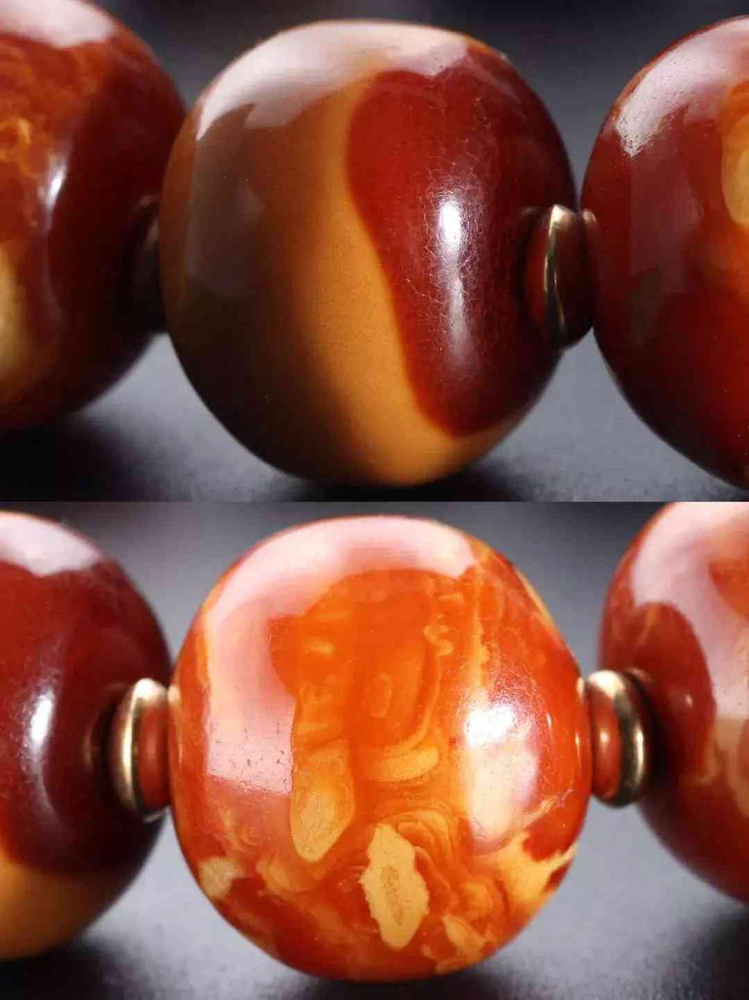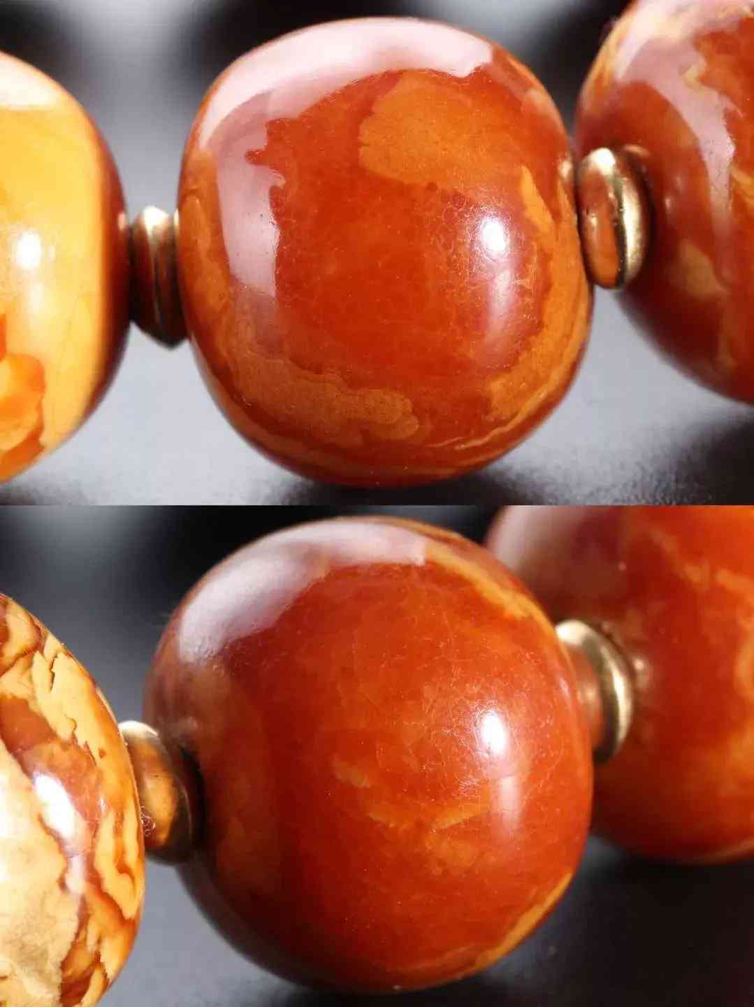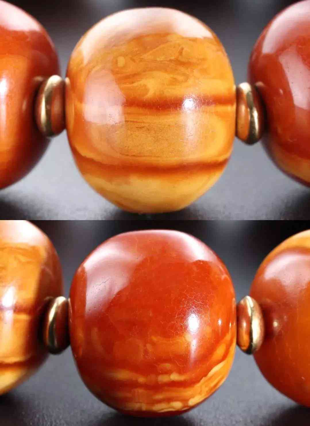 每个珠子都有自己独特的纹路,只有蜡质非常浓厚的白花蜡才能在变成老蜡时候依然这么行云流水纹路清晰。而大部分琥珀、一色黄蜡在经年累月的时间消耗中变成单一的深黄直至枣红色,所有被岁月打磨的蜜蜡都很美,但是白花蜡却非常醒目。