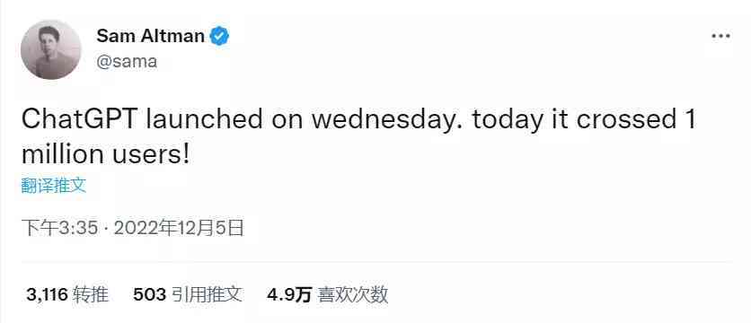12月5日,OpenAI的CEO Sam Altman在推特上发文称,自周三(11月30日)发布后ChatGPT的用户已经突破100万了。