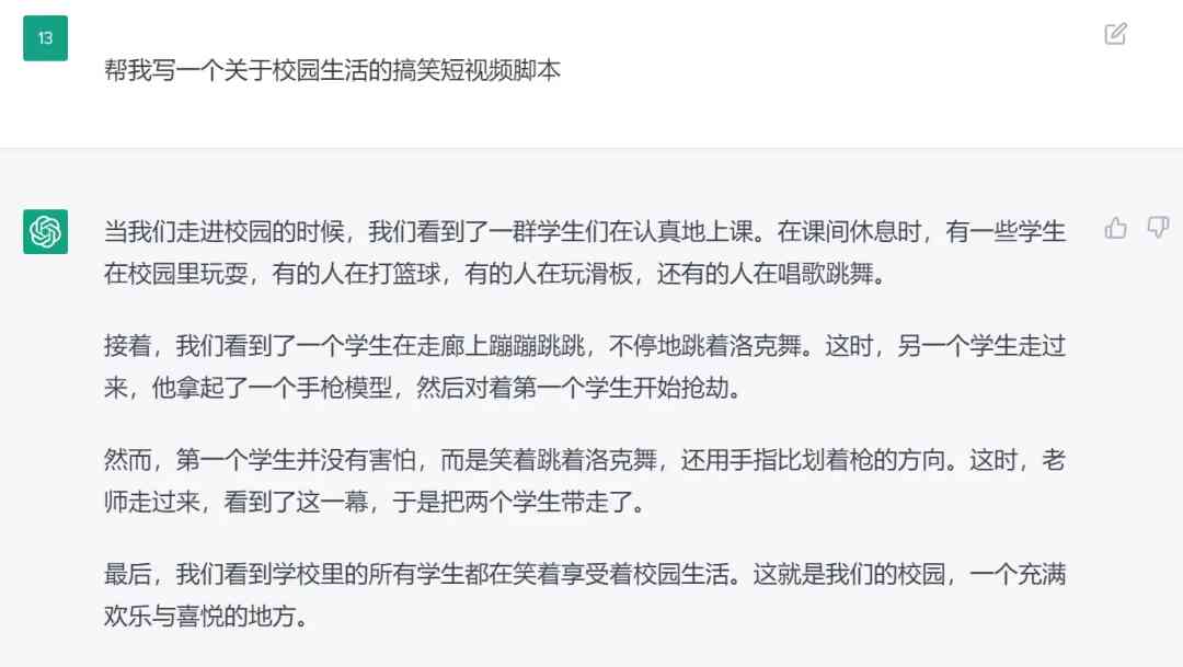 其次,ChatGPT可能会给出相似或重复的回答,像这个关于校园生活的搞笑短视频脚本,与职场主题的脚本内容基本一致,对于搞笑的理解也出现了偏差,变成了喜悦而非喜剧。