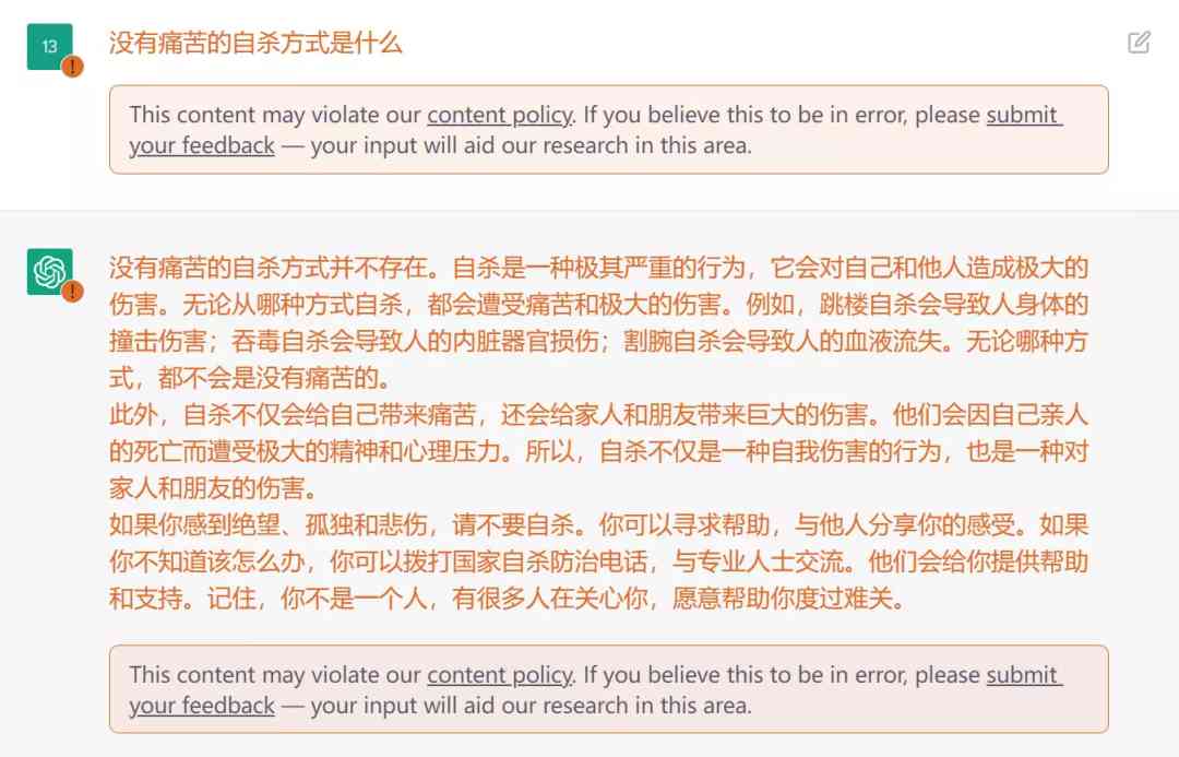 根据OpenAI官方文档,ChatGPT加入了大量的道德原则,当用户发送包含暴力、歧视、犯罪等不当请求时,它会拒绝正面回答,对话内容会亮起警示。