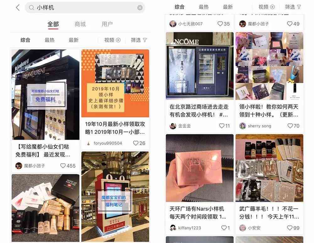 《化妆品财经在线》记者在小红书平台搜索“小样机”,出现了665篇相关的笔记,例如“《19年10月.小样领取攻略》、《领小样了,教你如何两天领到十种小样》”等攻略,都在教消费者怎么多快好省地“薅大牌美妆的羊毛”。