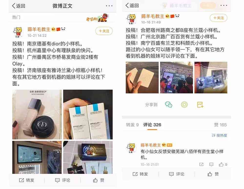 除了小红书上“自来水”的攻略指南,微博也成了信息互换的重要场地。消费者像玩寻宝游戏一样,热情洋溢地寻找着下一个“小样机”的坐标。与此同时,他们也成为了美妆品牌潜客数据库中的一个条目,与商场最渴望的络绎不绝的人流中的一分子。