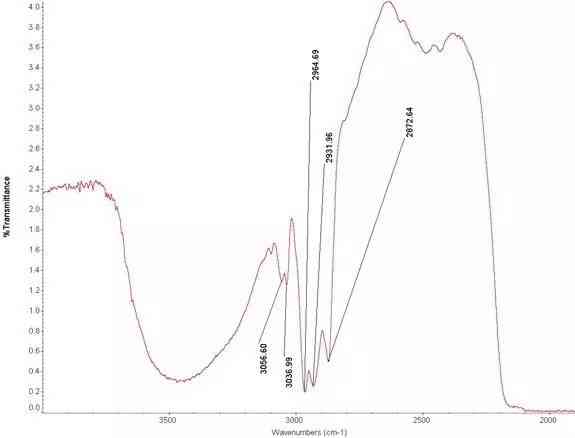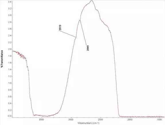 图27 翡翠A货红外光谱。A货红外光谱,只有两个蜡的峰位。