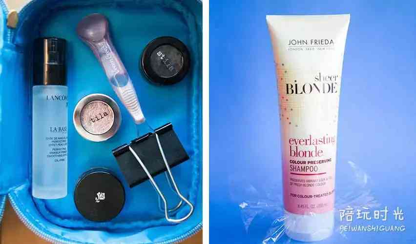妈妈们必带的化妆品比较容易漏,尤其是精油、液态水乳等,可以事先在化妆品瓶口套上一层保鲜膜,这样可以防止它们漏得化妆包哪里都是。
