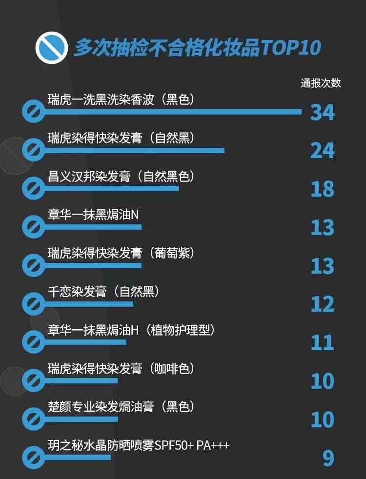 剔除200多批次监管部门认定的假冒产品,其余不合格化妆品共有1600多批次。其中,标称“广东瑞虎精细化工有限公司”的瑞虎一洗黑洗染香波(黑色)被通报34次,上榜次数最多;标称该公司另一款产品瑞虎染得快染发膏(自然黑)被通报24次,排在第二位;“广州市汉邦化妆品有限公司”的昌义汉邦染发膏(自然黑色)被通报18次,位列第三。