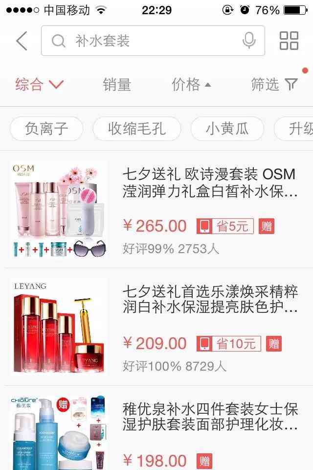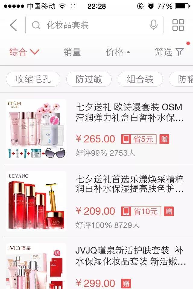 我一个西安的朋友当时看到我排名这么靠前,过来跟我学了优化排名的方法后,也跟着我去优化,后来他的排名也紧跟着我的排名,图中209这款化妆品套装就是他家的。