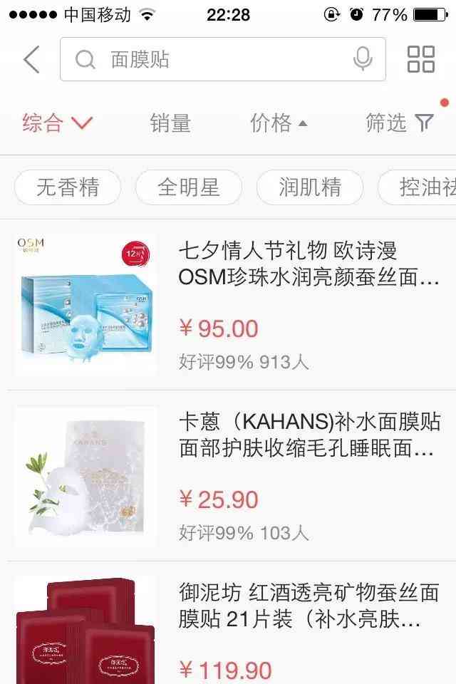 面膜京东当时占首页前面坑位的是40-60元(5-10片)价位,119元21片价位两个段位,颜色为白色、红色居多,我选了一款定价是99元20片蓝色盒装的面膜。这样的话,价位和色调就有所差异化了。