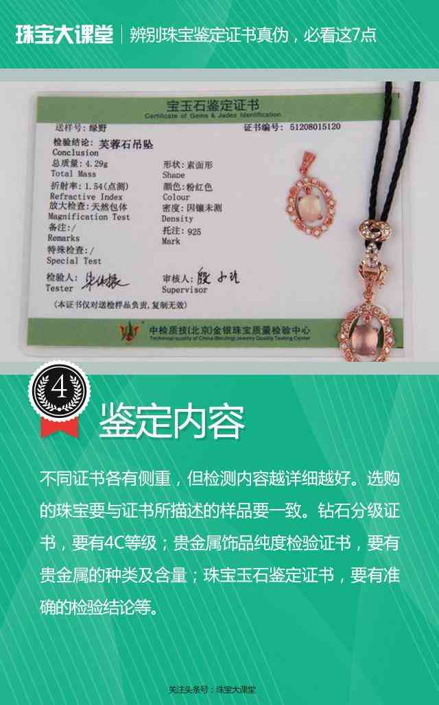 不同证书各有侧重,但检测内容越详细越好。选购的珠宝要与证书所描述的样品要一致。钻石分级证书,要有4C等级;贵金属饰品纯度检验证书,要有贵金属的种类及含量;珠宝玉石鉴定证书,要有准确的检验结论等。