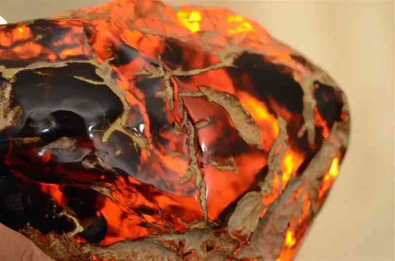 其次,透光光线下观察。这种角度下可以清晰的观察到琥珀原矿内部情况,其主要目的是为了看清裂纹和杂质的多少。众所周知,琥珀原矿表面覆有尘土,如果土层较厚,将琥珀全部包裹其中,这种情况下很难准确判断琥珀真实净度。在逆光角度下就可以清楚的看到内部情况,从而判断琥珀净度的高低。