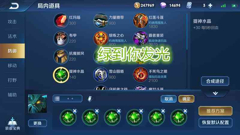 绿水晶价格为140金币,是所有水晶中最便宜的道具。他有每5秒回30点血的特性,可以用来合成具有回血效果的霸者重装和不死鸟之眼,建议吸血类战士使用。
