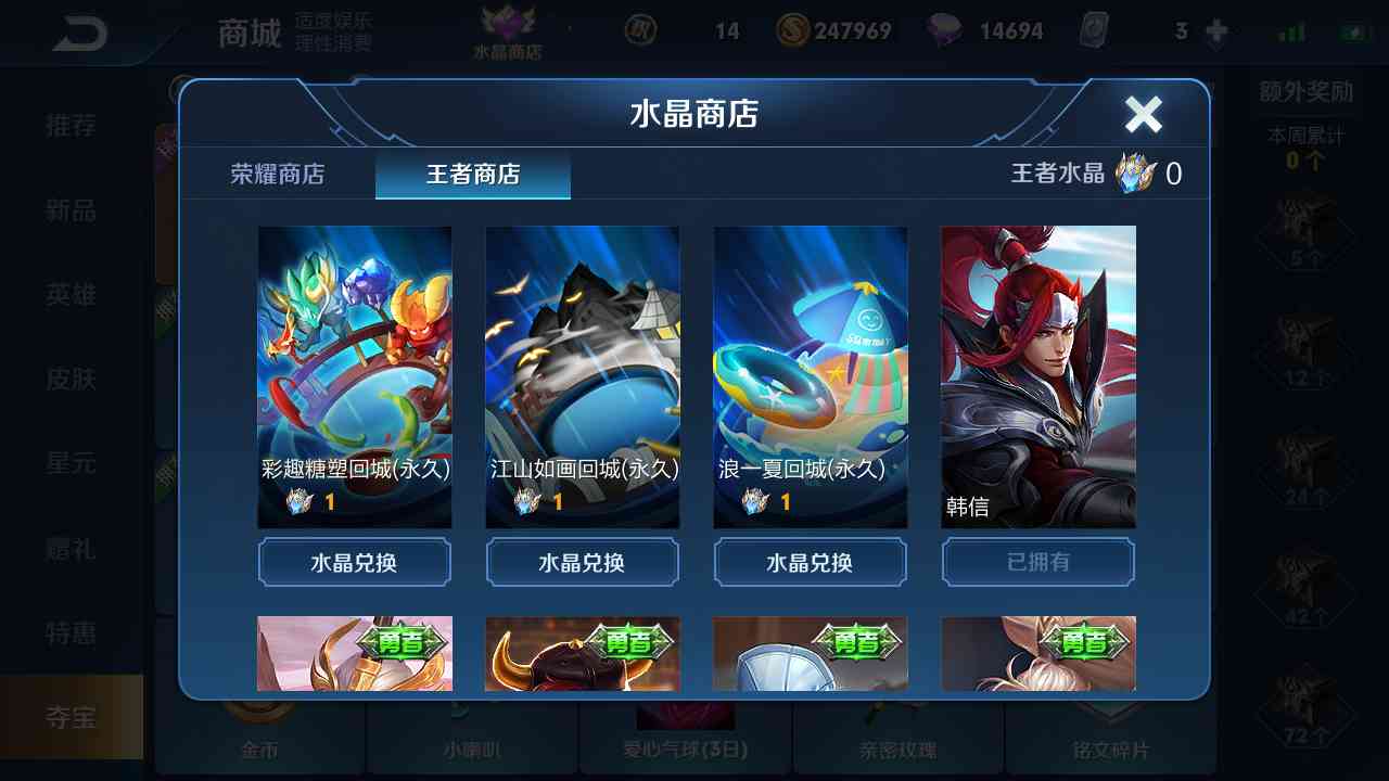 王者水晶是零氪金玩家的福利,用钻石就能获取。一般抽满200次,玩家就能获得王者水晶。而王者水晶可以免费兑换皮肤、英雄韩信、回城特效等物,是真正的良心水晶了。