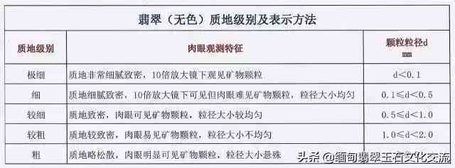 质地是评价翡翠品质的另一个重要指标,在翡翠(无色)中通常透明度较高的翡翠质地级别也会相对较高。质地级别根据翡翠组成矿物的颗粒划分为五个级别。(见表)