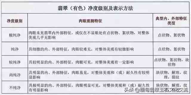 根据内含物对翡翠美观和耐久性的影响程度,将净度分为五个级别。(见表)